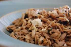 Cook the orzo until al dente, then drain. Mix in the spinach while the orzo is hot, so that the steam from the pasta makes the leaves wilt and you don't have to cook the spinach separately. (I do love short cuts.)